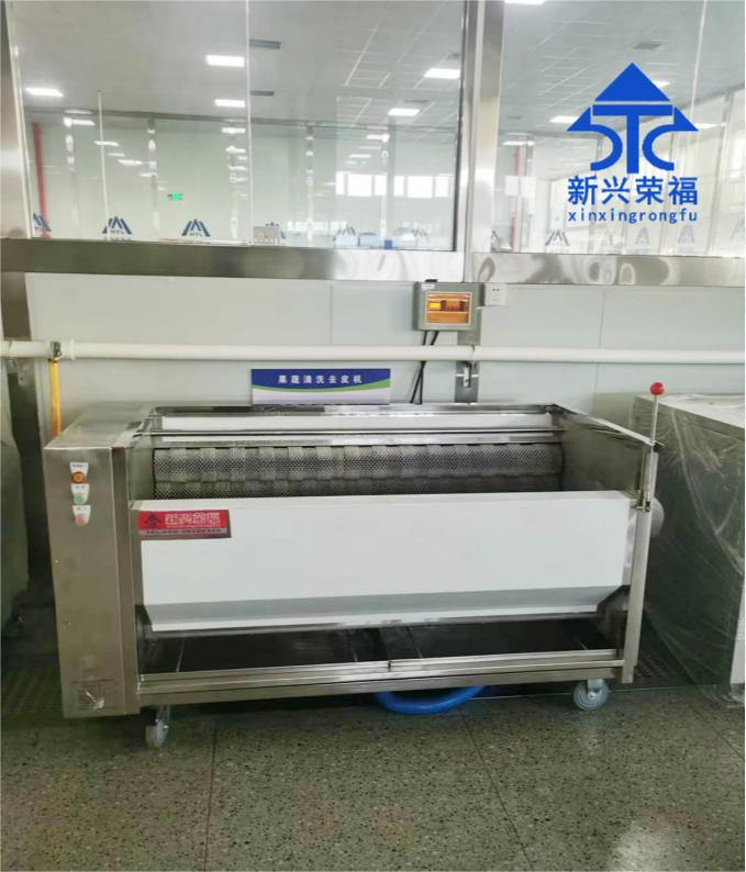 該項目采用的新興榮福蔬菜清洗線設備,包括含有六工位挑選輸送機、多功能切菜機、快速拆裝型提升機、水流式渦輪清洗機(高缸)、水流式渦輪清洗機(低缸)、震動瀝水機等。